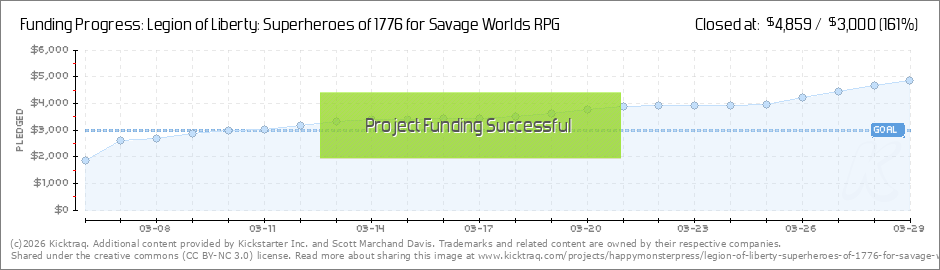 On Day 3, Legion of Liberty is 88% funded, in no small part due to the recent field promotion of Superbacker Rob Towell from Captain of the Legion to General of the Continental Army. THANK YOU, General Towell! In celebration, the Happy Monster... (Read More)