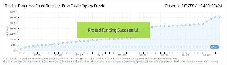 Hey all! Thanks so much for backing the Count Dracula's Bran Castle Jigsaw Puzzle. With 20 days to go, we are way above goal and well into production. The puzzles are scheduled for assembly at the end of the month, and I'm hoping to get my hands on a... (Read More)