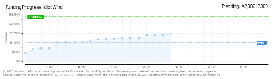 Help your backers reach your daily goals and help others see how you're doing. It's easy, with Kicktraq Mini.Here are a few quick snippits of code you can use to embed your personalized widget on your website, in your blog, and even on your favorite forum.