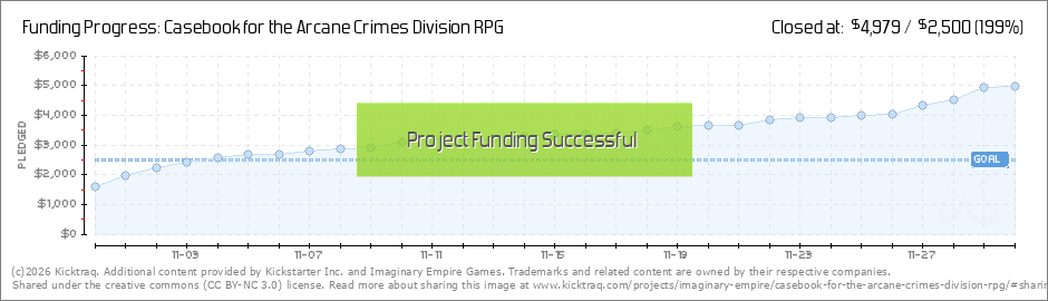 Thanks to the fantastic support of 141 Backers, The Casebook for Arcane Crimes Division will be a reality! On behalf of the writing team, thanks for the support. The primary channel of communication for the project will be via Kickstarter... (Read More)