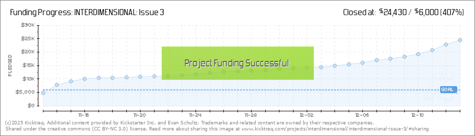 We passed 20k, which means the final, secret stretch goal just unlocked: MORE STORIES. That's right, we now have the ability to add two additional short stories to Interdimensional 3, adding a total of 12 pages to the already-packed issue. This is... (Read More)
