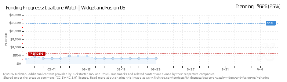 Help your backers reach your daily goals and help others see how you're doing. It's easy, with Kicktraq Mini.Here are a few quick snippits of code you can use to embed your personalized widget on your website, in your blog, and even on your favorite forum.