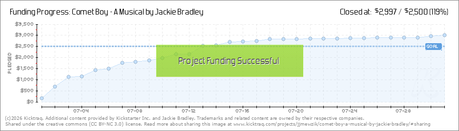 Sending a huge "Thank You" to all of my backers who helped to kick off "Comet Boy's" Kickstarter campaign. Your generosity is so appreciated! I am moved to tears each time a backer casts their vote of confidence for this project. This musical has... (Read More)