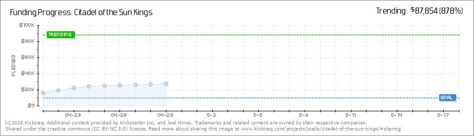 Howdy backers,We're funded! Thanks so much for your support again and getting Citadel of the Sun Kings made within the first couple hours of the Kickstarter. We're looking forward to some more stretch goals in and filling the rewards with even more... (Read More)