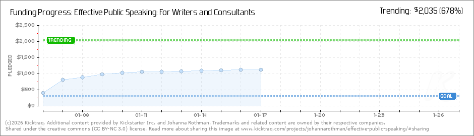 Thank you all so, so much. I was worried about funding, but we funded! Now, I have the wonderful problem of what to consider for stretch goals. (You know there will be something to do with speaking!) Thank you. (Read More)