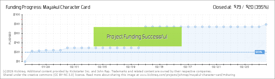Help your backers reach your daily goals and help others see how you're doing. It's easy, with Kicktraq Mini.Here are a few quick snippits of code you can use to embed your personalized widget on your website, in your blog, and even on your favorite forum.