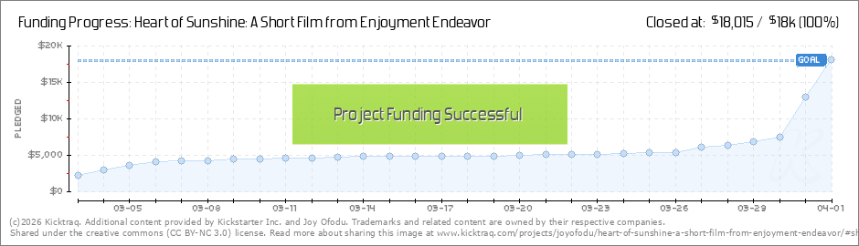 We're more than halfway through our fundraising campaign, but still short of halfway funded.💡WELCOMING All Ideas and forms of support, big or small, to help get our Kickstarter for the short film “Heart of Sunshine” over the Finish... (Read More)