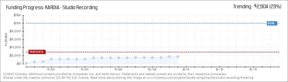 Help your backers reach your daily goals and help others see how you're doing. It's easy, with Kicktraq Mini.Here are a few quick snippits of code you can use to embed your personalized widget on your website, in your blog, and even on your favorite forum.