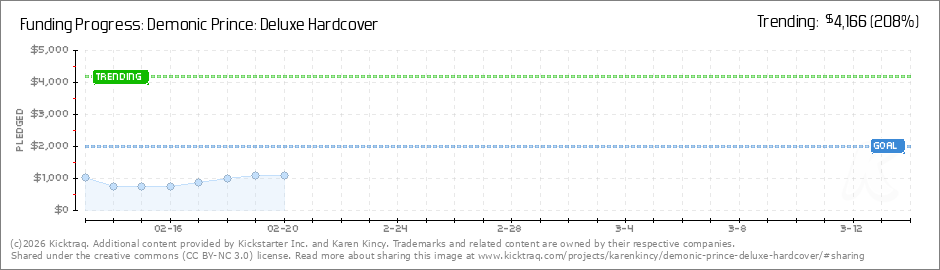 Help your backers reach your daily goals and help others see how you're doing. It's easy, with Kicktraq Mini.Here are a few quick snippits of code you can use to embed your personalized widget on your website, in your blog, and even on your favorite forum.
