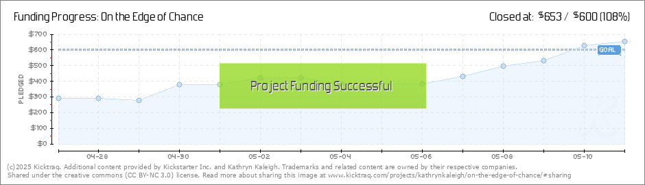 Thank you all so much for the support of my On the Edge of Chance Kickstarter. I am so grateful to all of you. What happens next? Help pass the word to get to the stretch goals. If we can reach some stretch goals, I get to send you even more books!... (Read More)