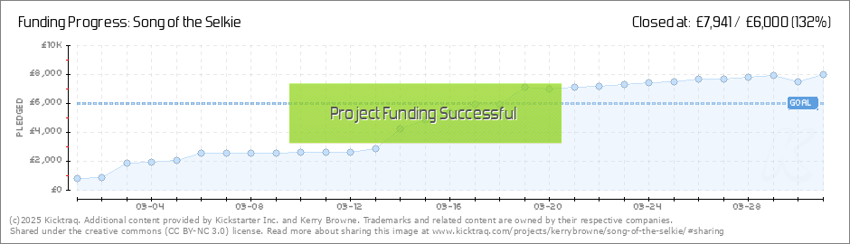 The first day of the campaign and we are now over 10% funded. Thank you so much. Please continue to share the campaign far and wide - the more people see it, the better our chance of meeting our goal and ultimately, completing Song of the Selkie. (Read More)
