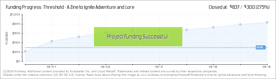 Fully Funded!We hit the mark this AM, thanks to everyone who pitched in to make this happen. A couple questions have come in and I would like to answer them here: Page countI am anticipating 24 pages. For a zine, the way I lay them out, that means I... (Read More)