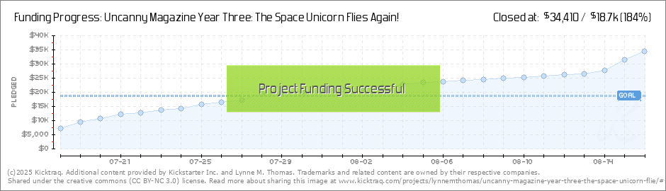 Wondrous Space Unicorns! We are in the final 35 hours of the Uncanny Magazine Year 3 Kickstarter! We're nearly 50% of the way to our returning the 2nd Extra Story per Issue Stretch Goal! This is an important goal which we reached in Years 1 &... (Read More)