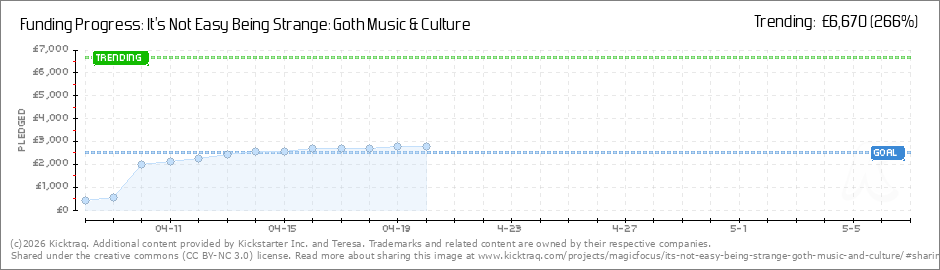 Help your backers reach your daily goals and help others see how you're doing. It's easy, with Kicktraq Mini.Here are a few quick snippits of code you can use to embed your personalized widget on your website, in your blog, and even on your favorite forum.