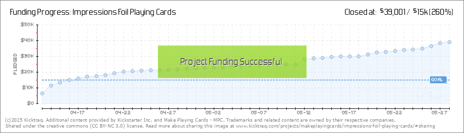 Dear All We're Funded! Thanks all so much for backing our Impressions Foil playing cards which was funded on Friday. These cards will now become a reality which you all helped to make it happen. We truly believe these are a great deck of cards and... (Read More)