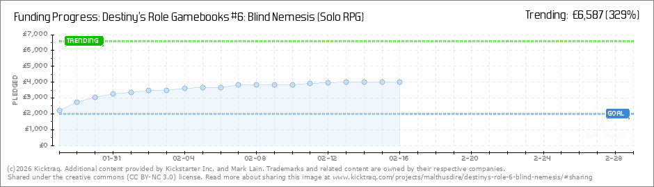 Hello All We are now just £70 shy of reaching Stretch Goal #3 where all backers at the BLIND CHANCE tier and above will receive an exclusive BLIND NEMESIS t-shirt featuring the DESTINY'S ROLE logo and Waclaw Traier's cover image from the book in all... (Read More)