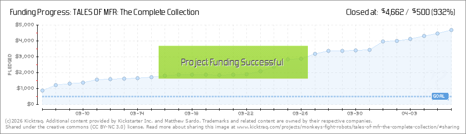 Good afternoon! What a great couple of days. We reached our funding goal. Kickstarter made us a "Project We Love." Last night we got an email from Bill Sienkiewicz: "Monkeys Fighting Robots is exactly what it sounds like. It isn't cute, adorable,... (Read More)