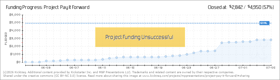 Quick update! Project: Pay it Forward just broke the $1000 funds mark. We have $3950 to go in 12 days, but it is still possible! Thanks for all of the support and continue to have a great day! Much Love, M&P Here is an uplifting short video on... (Read More)