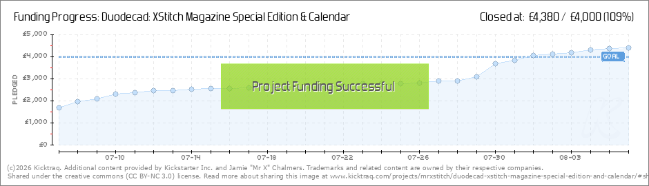 Happy days! We have hit the goal so the cross stitch challenge of the decade (DuoDecade?) can begin! Thanks to everyone who has supported so far - there's still time to spread the word! (Read More)