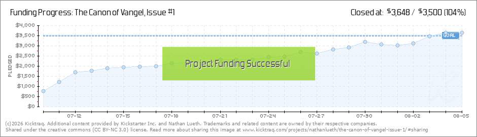 Woo Hoo! Week one is all done and The Canon of Vangel, Issue 1 is 61% funded! This campaign is three weeks long, so being two-thirds funded when the Kickstarter is one-third done feels very appropriate. What’s more, everyone who has backed thus far... (Read More)
