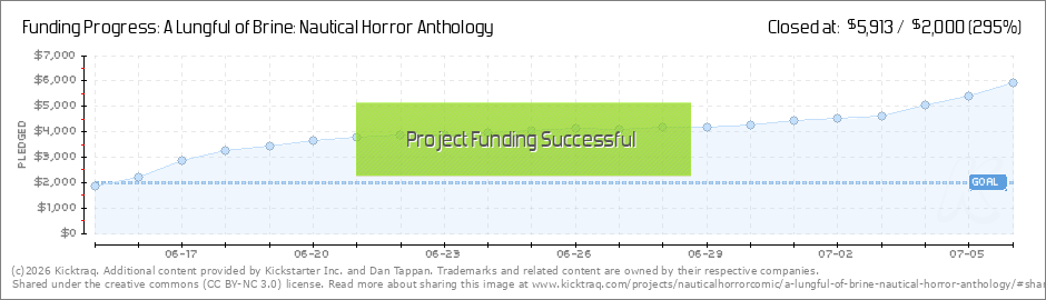 Thankfully, my lungs are not full of brine—but my heart is very, very full. In just 24 hours, A Lungful of Brine: Nautical Horror Stories, is fully funded!!! I'm absolutely touched that so many people have rallied together to make this happen.... (Read More)