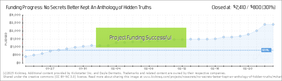 We have funded! That means I can pay the authors 1¢/word. Hurrah! The next stretch goal is $2100, which will mean I can pay the authors 3¢/word. I appreciate and love everyone who’s backed the campaig (even if I don't know who you are)! Thank... (Read More)