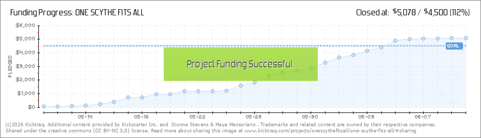25 Days remain for One Scythe Fits All ...To reach our goal of 4500$ Pass the word along and we will show you the goods! Thank you to our first wave of backers, now it's time for more action! (Read More)