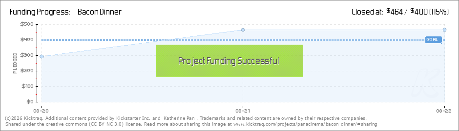 Hello! Nicole and I are excited to start planning the best bacon dinner for y'all. We appreciate your support -- especial shoutout to those of you who backed just to show support. For those who are attending our dinner, consider asking a friend to... (Read More)