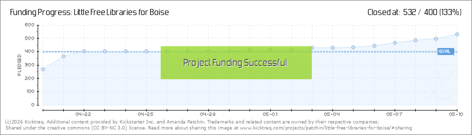 Hurray! Thanks to all 12 backers for getting us funded! Now let's build toward a second Little Free Library in the Boise area. I will be looking for a location and volunteer steward. Please continue to share the project so we can build more... (Read More)