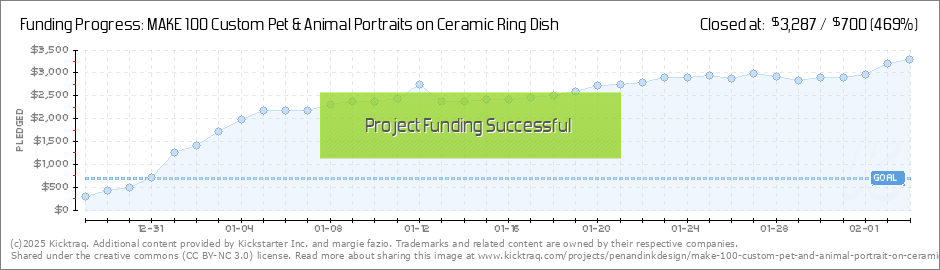 Thank you Wonderful Backers, The Make 100 Custom Pet and Animal Portrait Ring Dishes is fully funded! I am so very honored. Now is the time to start taking or gathering your pet photos! For each ring dish, it would be great to have 1-3 photos of... (Read More)