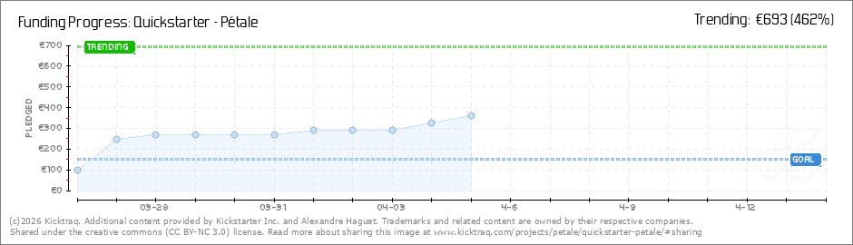 Help your backers reach your daily goals and help others see how you're doing. It's easy, with Kicktraq Mini.Here are a few quick snippits of code you can use to embed your personalized widget on your website, in your blog, and even on your favorite forum.