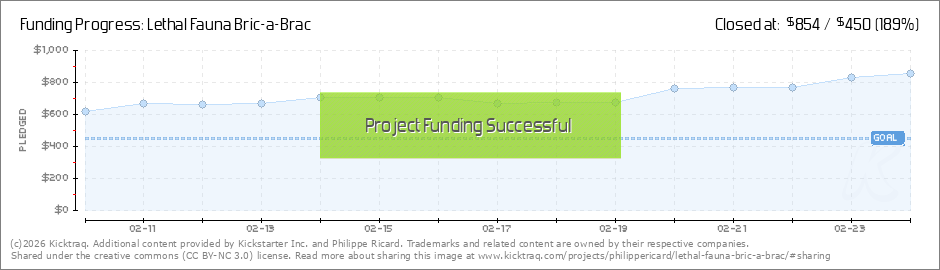 Hey all! Good news: Lethal Fauna Bric-a-Brac is fully funded. And it happened in just under two hours to boot! Thank you to everyone who's chipped in so far! I'm really excited about this zine, just for the thrill of making monsters, but also... (Read More)