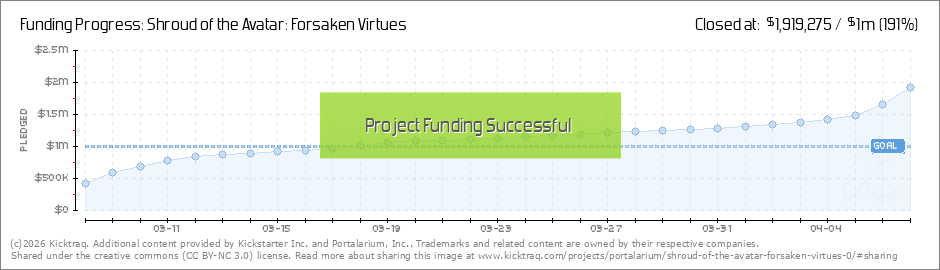 Mittlerweile sind bei der Kickstarter-Aktion mehr als 700.000 Dollar für das Rollenspiel Shroud of the Avatar: Forsaken Virtues zusammengekommen. Sollte der Geldfluss auf einem ähnlichen Niveau bleiben, wird die Aktion laut der Statistikseite Kicktraq am Ende zirka 5,5 Millionen Dollar erzielen. (Read More)