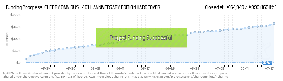 In a search for 'Omnibus' on Kickstarter, the Cherry Omnibus now ranks number 10 in the MOST FUNDED category, outpacing Legendary Comics aka Legendary Pictures, (as in Zack Snyder's DC films, etc.), and Dynamite Entertainment's The Boys, which the... (Read More)