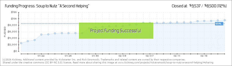 I'd like to thank all of you for making this project a success! We are 112% funded and Soup to Nutz A Second Helping will be going to publication shortly. In the next 14 days Kickstarter will be processing your pledges and once that process is... (Read More)