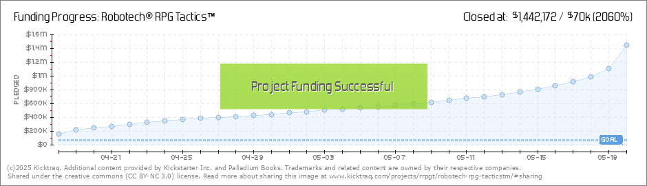 On April 18th, Palladium Books launched a Kickstarter campaign to crowd-fund strategy battle game Robotech RPG Tactics, based on the localized version of The Super Dimension Fortress Macross, Super Dimension Cavalry Southern Cross and Genesis Climber MOSPEADA. Three hours later, the $70,000 goal was met. Today, almost a quarter million dollars has been pledged, including three folks who have signed over $3,500 for the Bursting Point - Early Bird Special incentive. (Read More)