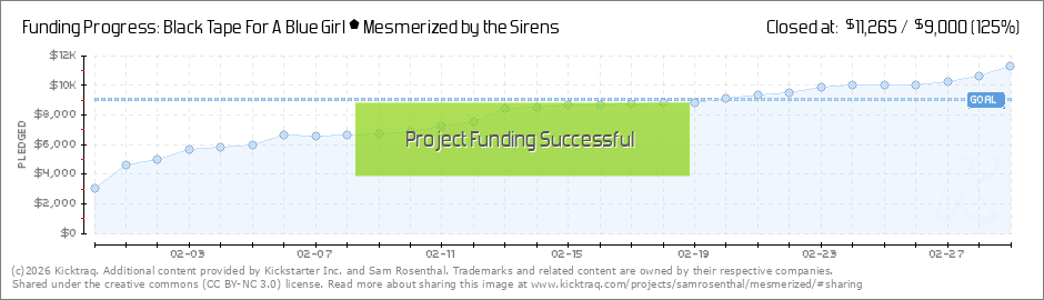 $4,977 pledged | 55% funded | 89 backers | 26 days to go Black Tape For A Blue Girl's Mesmerized by the sirens campaign was chosen as a “Projekt We Love” by Kickstarter. It is featured on this page and there's a tag under the video on the... (Read More)