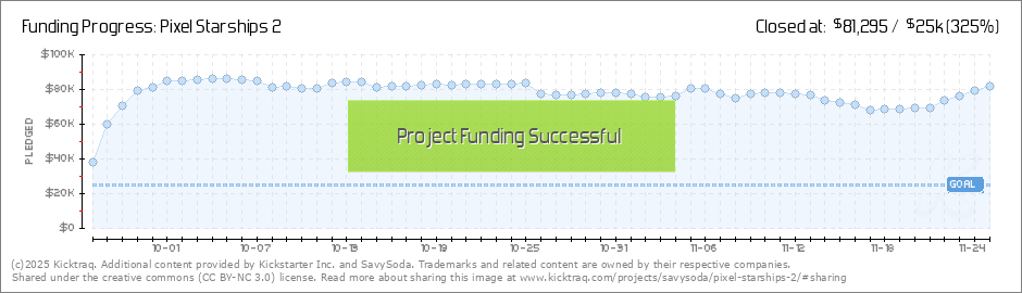 SavySoda, the team behind Pixel Starships, recently launched a Kickstarter campaign to fund a sequel, which is unsurprisingly called Pixel Starships 2. The project's goal was $25,000, a target that was shattered within 24 hours and now stands at $65,000. (Read More)