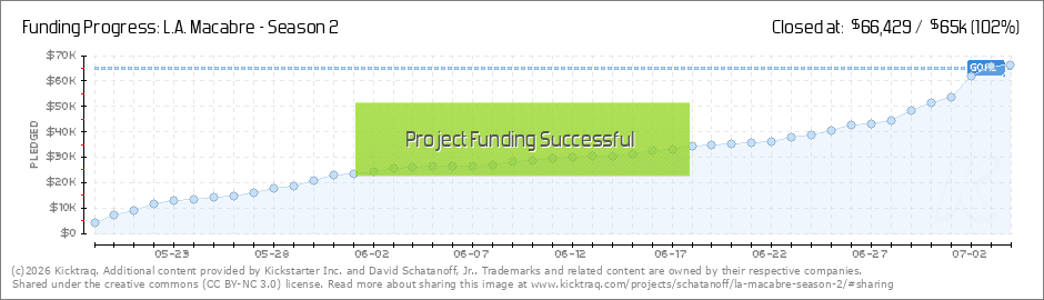 WE ARE AT 20% !!!We can't believe the outpouring of support for the second season of L.A. Macabre! Because of our backer's generosity, we've passed the 20% of our goal mark in just FIVE DAYS! We're so grateful to have people that are supporting our... (Read More)