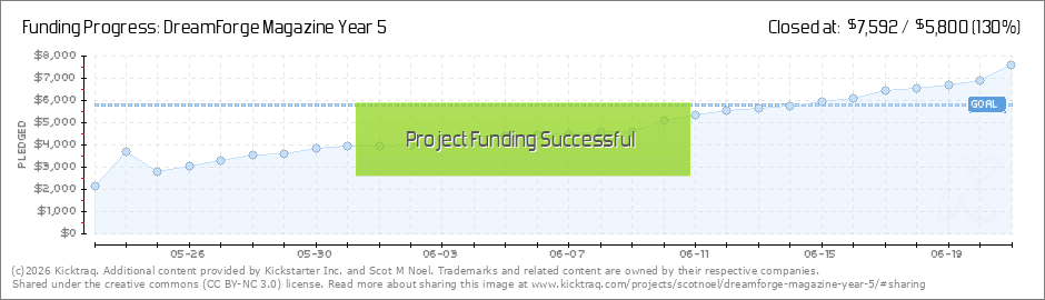 DreamForge Year 5 has Reached It's Funding Goal! Thank You All, Kickstarter Heroes! Now we're going to see if we can hit our Stretch Goal of paying $0.08/word! There's time to do it. Wish us luck and cross all your fingers! New Pledge Available!... (Read More)