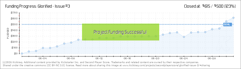 One week into our campaign for Issue #3, and we're off to a fast start! With 9 backers and $125 raised, we're already one-fourth of the way toward our goal. Thank you so much to everyone who's backed the project so far! As an extra treat, here's an... (Read More)