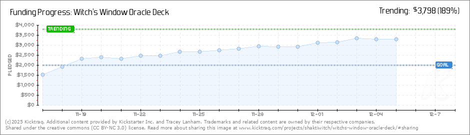 Hi Everyone, I am so excited! We are 98% funded with 19 days left to go in the campaign. I am deeply grateful to everybody who has backed Witch's Window Oracle so far. This is my first Kickstarter AND my first oracle deck, so I honestly had no idea... (Read More)