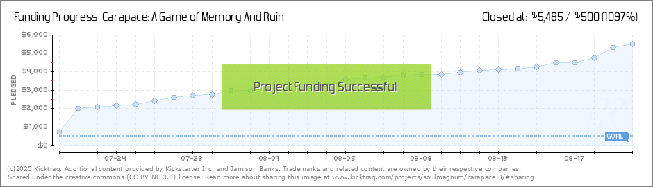 Thank you all for backing Carapace, which has now reached our funding goal in just over 8 hours! Wow! I am speechless, I didn't think you all would reach it this fast. First kickstarters, especially in our niche of a niche, can take a while! Now... (Read More)