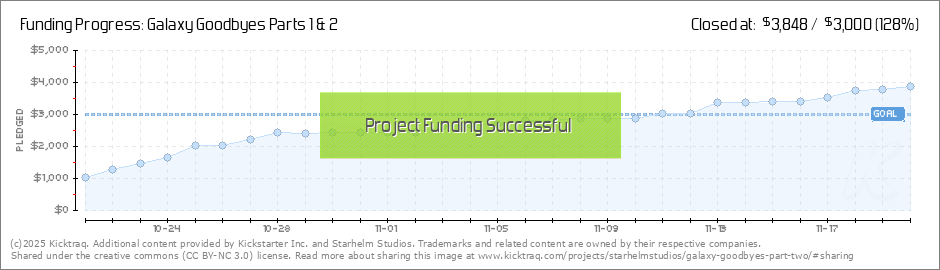 Part Two is now funded, thanks to you!Thank you for supporting Galaxy Goodbyes, Starhelm, and myself. Whether you're one of my close friends or family, someone across the United States, a returning face or a newcomer, or across borders and oceans... (Read More)