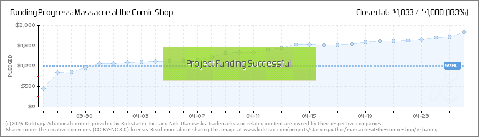 Massacre at the Comic Shop is funded! Now onto stretch goals. I'm hoping to break a few of them. And with that, there will be some rewards for you guys. Also, I was interviewed on the new episode of Apollo City Comics. I talk about Massacre at the... (Read More)