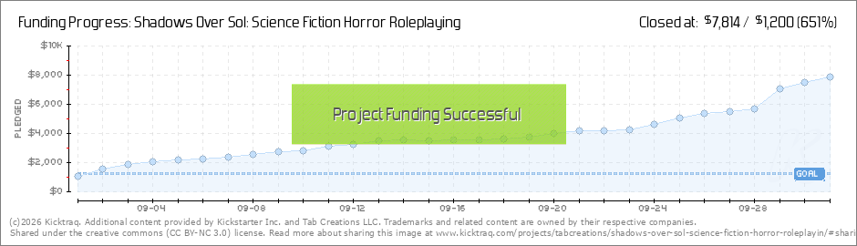 Hello Shadows Over Sol Backers! We love you! And you are helping make a great game even more awesome. Just this morning you unlocked our increased art budget stretch goal. These extra dollars will go to buying more art and better layout, making the... (Read More)