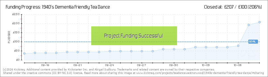 Thank you to our backers so far! 2 weeks to go, and people have volunteered to dance, sing, bake and help out. We've been featured in AGE UK's listings and local groups have also spread the word. If we meet our target then we can help people... (Read More)