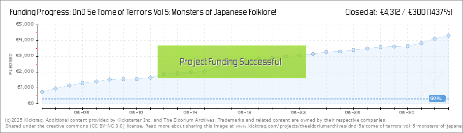 Stretch goal 5 has been unlocked!Now, everyone will now receive an additional brand-new Japanese Monster Lore+Statblock for a total of 5 Japanese monsters! #6 Stretch Goal RevealOnce reached, everyone will receive an additional new Japanese... (Read More)