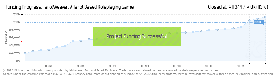 Thank you all so much. We're officially over the halfway point with 4 more weeks to go. We appreciate the incredible support we've received from all of you and are so excited that we're that much closer to bringing TarotWeaver to each and every one... (Read More)