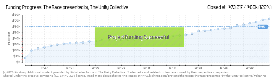 Greetings Unity Collective backers! We have made a huge statement to the world that we want The Race to happen, however we still have more “miles to tackle”!!! Using the half marathon analogy...we are hitting our stride and in the zone at Mile 8... (Read More)